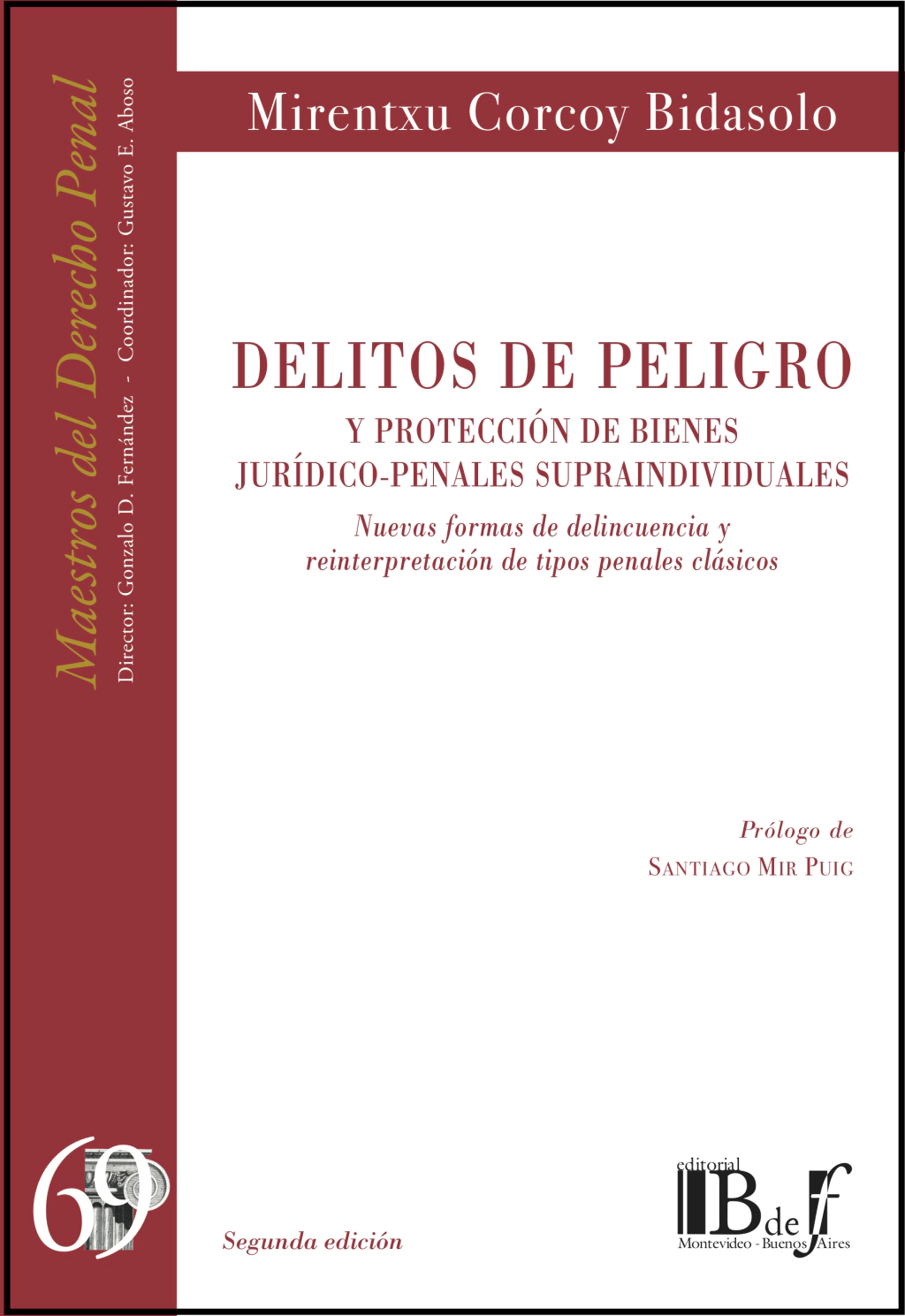 Corcoy Bidasolo, Mirentxu (catedrática española): Delitos de peligro y protección de bienes jurídico-penales supraindividuales. Concepto de peligro. Juicio sobre el peligro típicamente relevante. Concepto y clases de “delito de peligro”: la protección de bienes jurídicos supraindividuales. Teoría general de los “delitos de peligro” -algunos aspectos fundamentales-. Iter criminis. Tipo subjetivo. Problemas específicos de autoría y participación. Consecuencias de la autonomía de los “delitos de peligro” en relación con la solución concursal. Colección: Maestros del Derecho penal Nº 69. 2024. 366 pp. ISBN 978-9915-684-15-4.