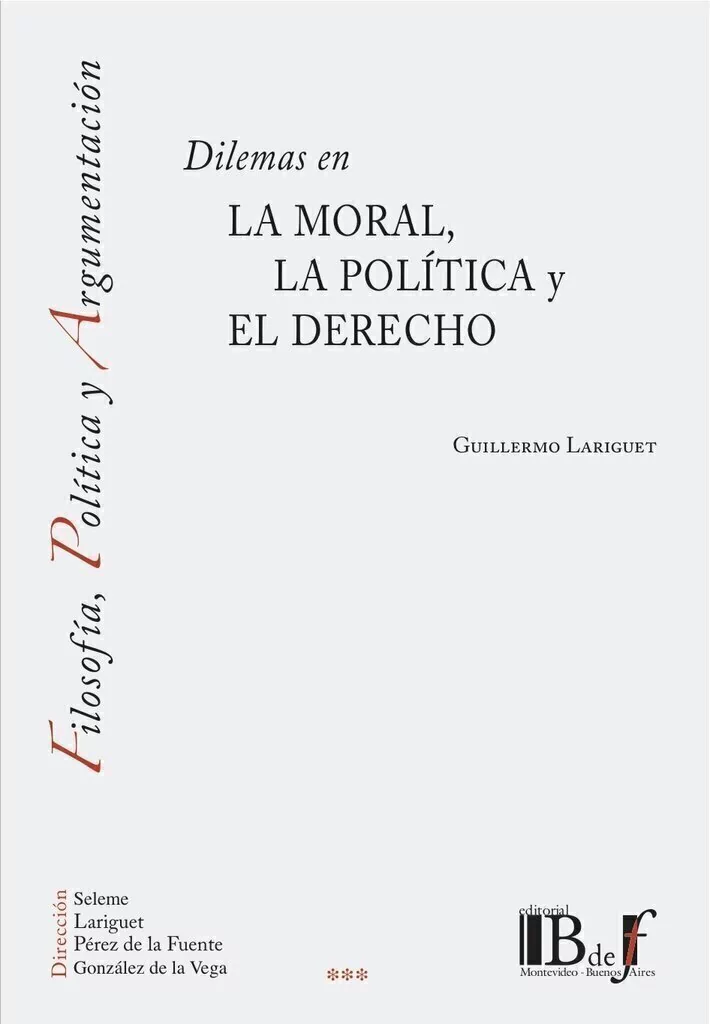 Lariguet, Guillermo: Dilemas en la moral, la política y el Derecho. Ética teórica o metaética. Filosofía práctica impura y normativa. Conflictos trágicos y derecho. Posibles desafíos. Los dilemas morales qua límites de la racionalidad práctica. Vida buena, conflictos e inconmensurabilidad. Dilemas y particularismo moral. Una introducción a “Encrucijadas morales”. Una aproximación a los dilemas y su impacto en el razonamiento práctico. Dilemas morales, escepticismo e imparcialidad. La ética frente a los dilemas trágicos. Conflictos constitucionales, inconmensurabilidad y resolución racional. Estrategias filosóficas para enfrentar conflictos trágicos. Las tensiones internas del pluralismo moral. Las fronteras de la argumentación moral. Un análisis crítico de la ética del discurso. Antiteoría en ética. Experimentación en ética. Ética, giro experimentalista y naturalismo débil. La presencia de la subjetividad en la metaética contemporánea. Una defensa del objetivismo moral. Ética normativa y ética aplicada. El debate sobre el juicio por jurados en el fuero penal – fundamentación lógica y legal de las sentencias. La supremacía práctica de los derechos humanos. Optimismo, pesimismo y moderación. Verdad, democracia y tolerancia. Tres interpelaciones críticas a “Political Emotions. Why Love Matters for Justice”. El rostro de Jano y el tema del aborto. Algunos comentarios a “The Moral Significance of Birth”. Problemas de constitucionalidad en un proyecto de ley. El registro provincial de huellas genéticas digitalizadas. La ética empresarial qua disciplina filosófica y la evaluación de la responsabilidad social de las empresas. Teoría y praxis de los principios bioéticos. ¿Es moralmente justificable la pena de muerte? Algunos comentarios a “Pena capital: un reexamen”. Colección: Filosofía, Política y Argumentación. 2017. 920 pp. I.S.B.N. 978-9974-745-34-6.