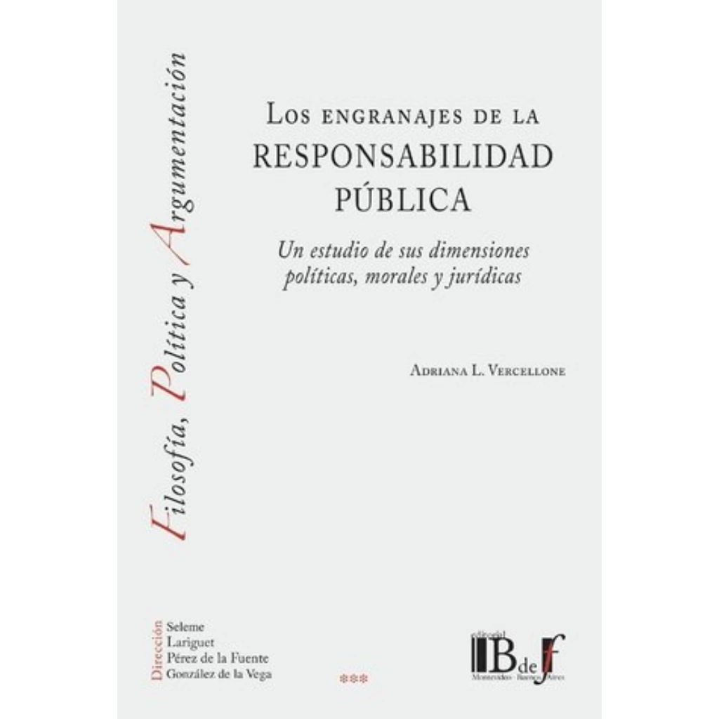 VERCELLONE, Adriana: Los engranajes de la responsabilidad pública. Un estudio de sus dimensiones políticas, morales y jurídicas. Burocracia, manos múltiples y responsabilidad. La responsabilidad personal de los funcionarios públicos. La responsabilidad colectiva por las manos múltiples. La responsabilidad jerárquica un principio a medida de la burocracia moderna. El argumento contractual sobre la responsabilidad: ¿una respuesta al problema de las manos múltiples? 2022. 208 pp.